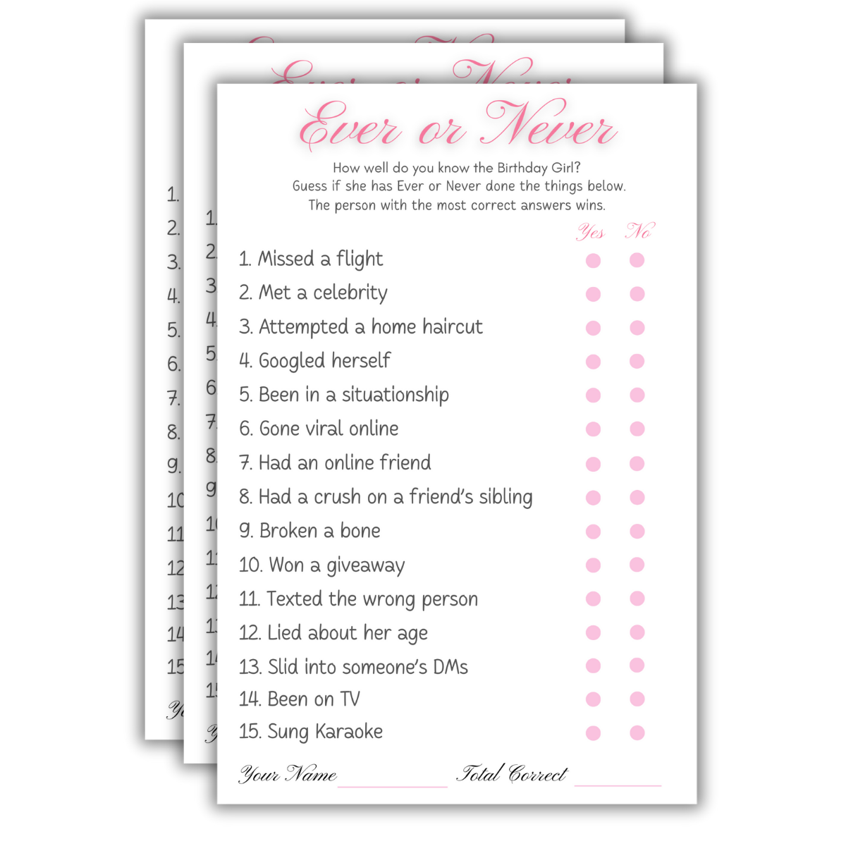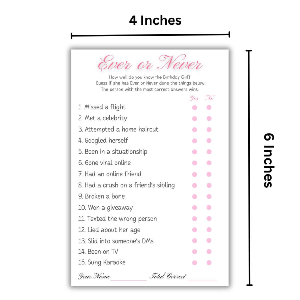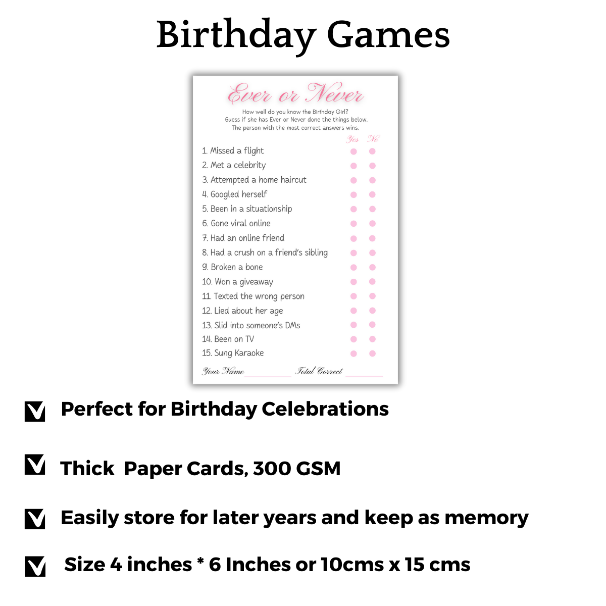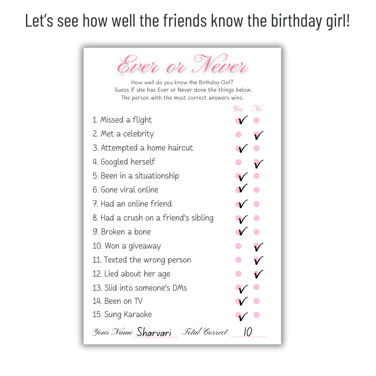 Give one card to each player. Read each statement and guess whether the birthday girl has ever or never done it by marking your answer. Once all guesses are made, the birthday girl reveals the correct answers. Count your correct guesses the player with the highest score wins.