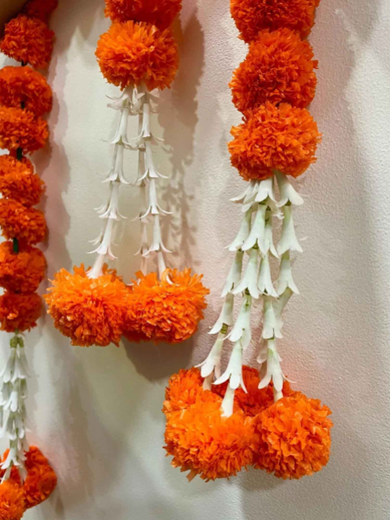 Our Marigold Garlands Orange are 5.5 ft / 167.64 cm length garlands. They come with a ring on top, which makes it easy to install it anywhere. These are reusable garlands, that can add style to any decor.