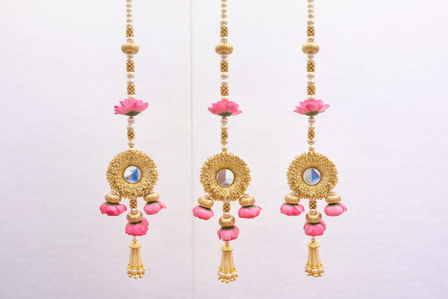 Bring timeless beauty and grace to your décor with these exquisite Pink Rose and Mirror Tassels. Featuring delicate strings of pearls adorned with soft pink roses on top, these tassels are further enhanced with golden embellishments, ornate motifs. The combination of Pink Rose and Mirror adds a fresh, elegant, and divine charm to any space.