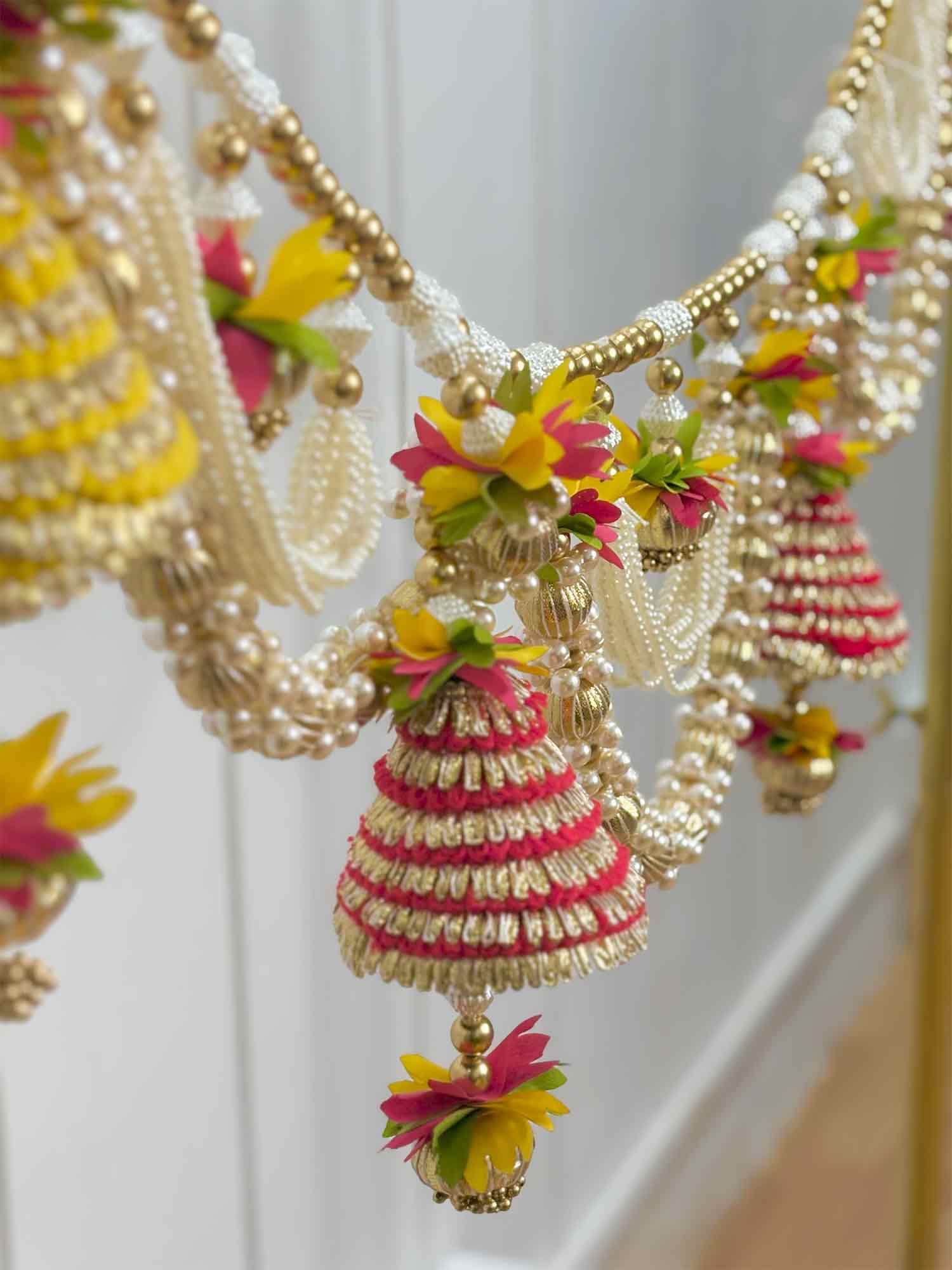 Bring charm and elegance to your home with this beautifully handcrafted beaded toran. Designed with strings of golden and pearl beads, it features vibrant bell-shaped hangings in red, yellow, and green, accented with floral details and dangling beads. The layered pearl garlands add a rich and traditional touch, making it perfect for decorating entrances, mandirs, living spaces, or festive backdrops.