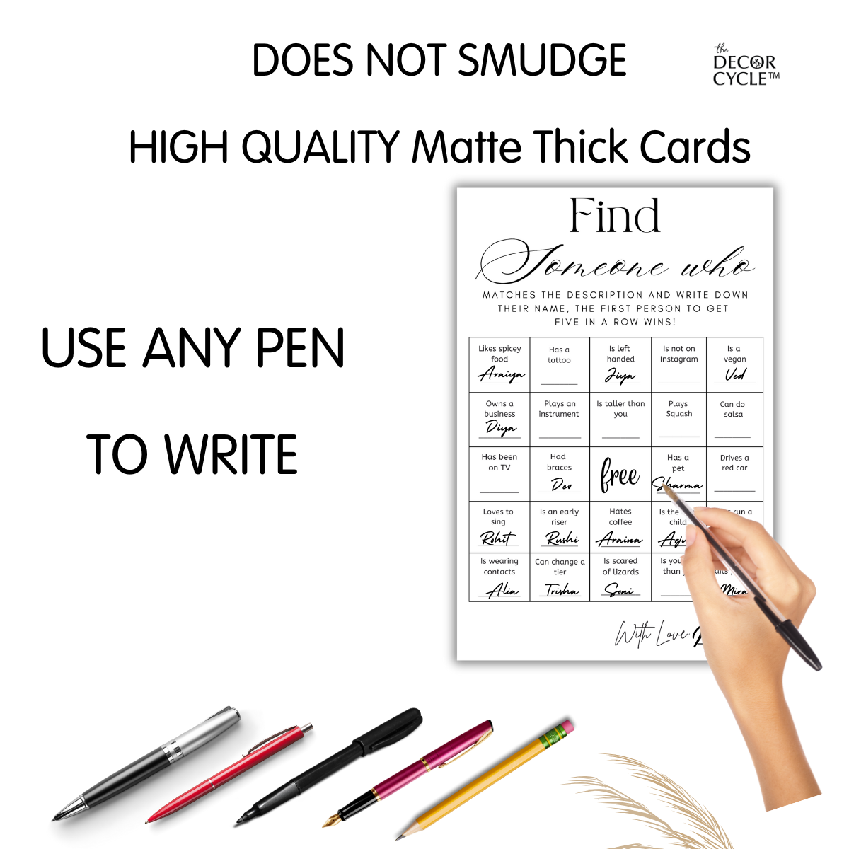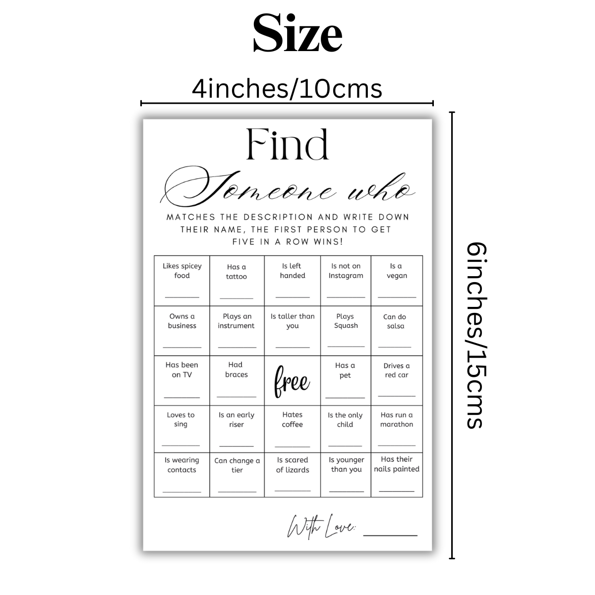 Get guests mingling and having fun right from the start! These interactive cards encourage everyone to find people who match different prompts and fill in their names a perfect game for weddings, parties, corporate events, or any gathering!