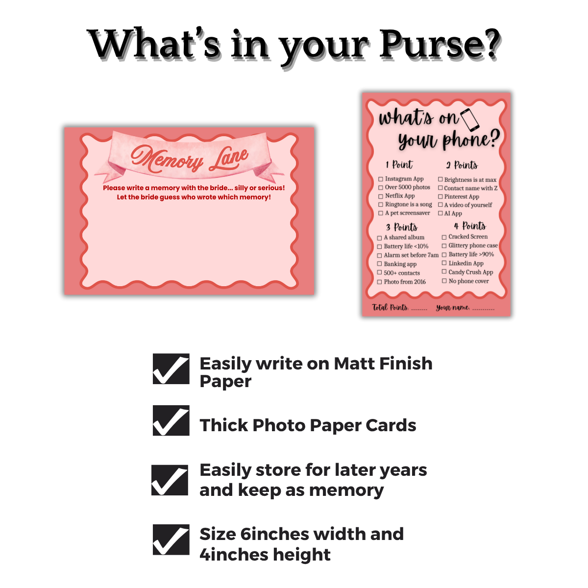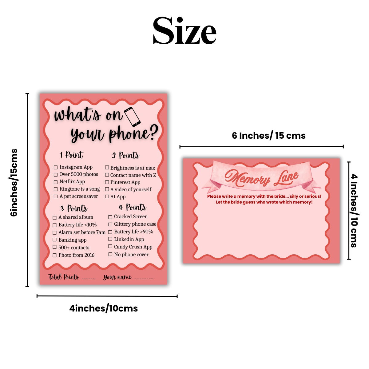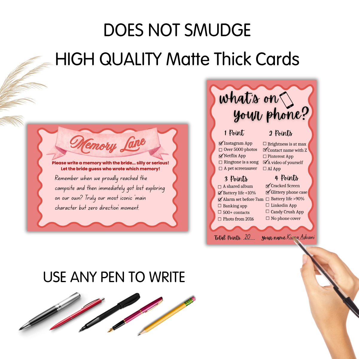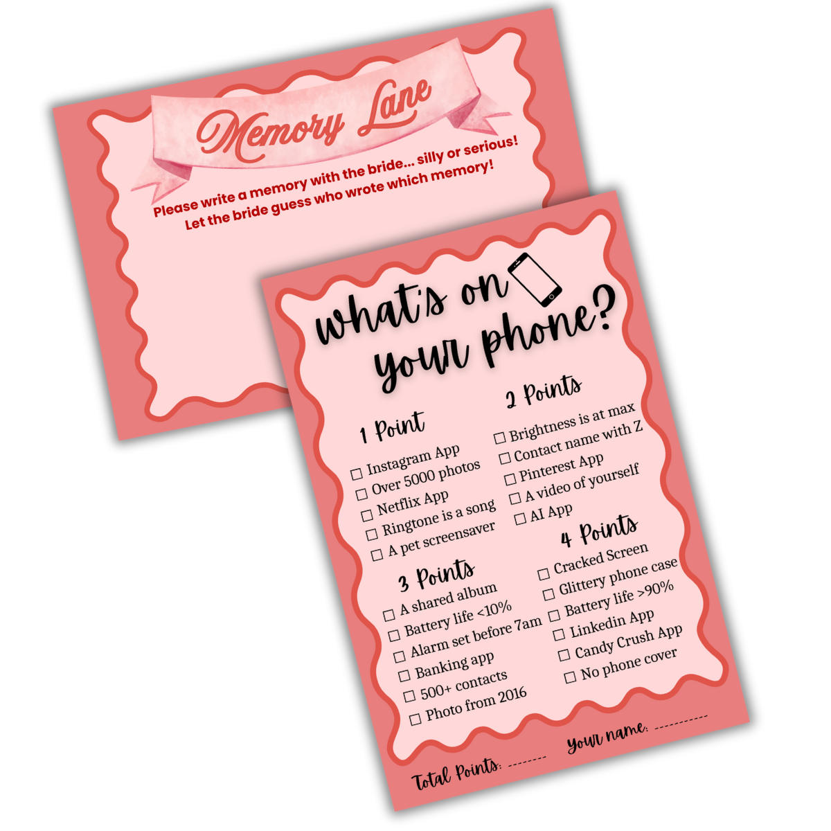 Bring laughter, memories, and connection to your celebration with this fun duo of bridal shower game cards — Memory Lane and What’s on Your Phone?