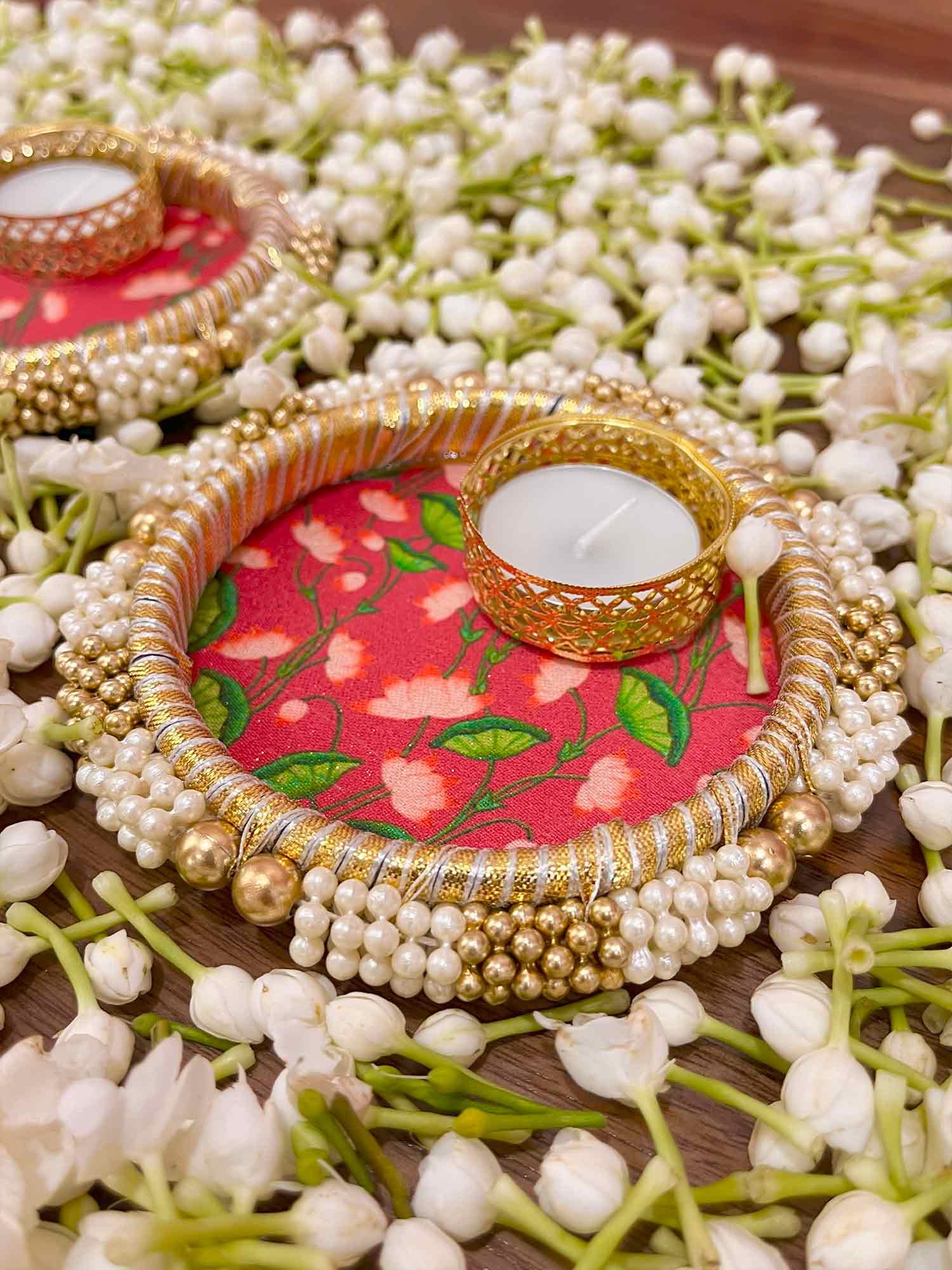 Add a touch of elegance and tradition to your festive décor with this exquisite set of 2 decorative diyas. Designed on a vibrant floral base, each diya is beautifully adorned with pearl and golden bead embellishments, finished with delicate detailing that makes them perfect for poojas, Diwali, weddings, and special occasions.