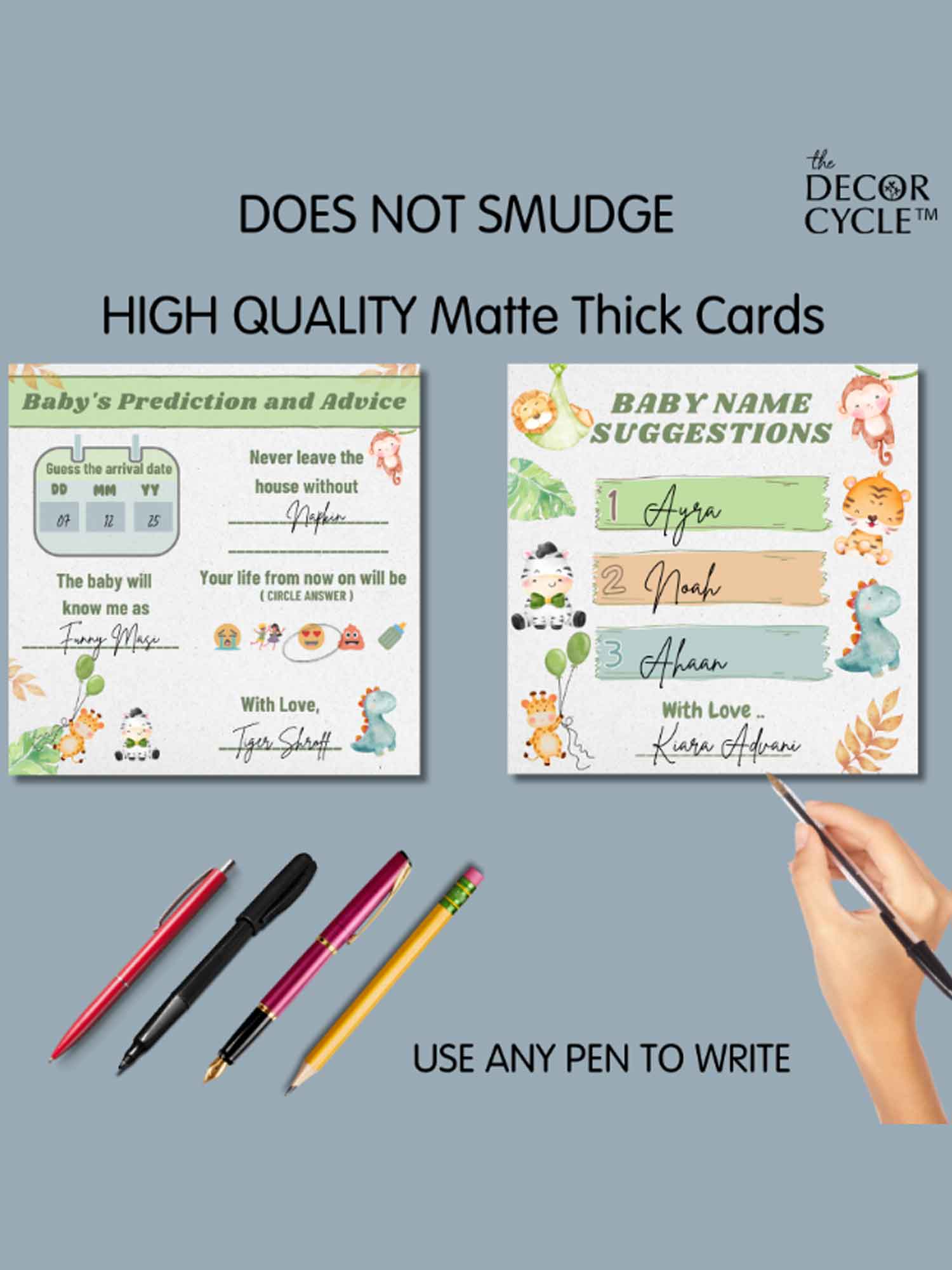 Innovative Game or Activity to make your Baby Shower or Mom To Be celebration fun & memorable for your guests. The thick card game includes a set of two card games. Baby Names Suggestion Game and Baby's Prediction and Advice game. Package Contents: Set of 10 cards each, total 20 cards. Printed on our easy to write matte finish lux paper. The size of card 4 inches by 4 inches/10cms*10cms. 300 GSM Paper. Wild, Jungle, Animals theme
